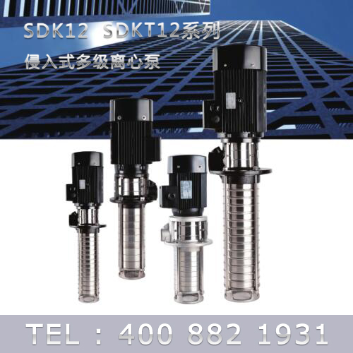 SDK12/SDKT12為配用標準電機的非自吸立式多級離心泵,電機軸和泵軸用聯(lián)軸器直接聯(lián)接的結構。為滿足水槽或容器的安裝深度,可安裝空套的腔體來改變泵本身的侵入 深度。